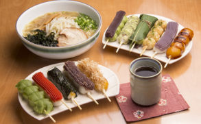 The shop is located on a charming stone paved street, an eight-minute walk from Matsue Castle. The shop, well-known for the best homemade dumpling in the city, boasts of a wide variety. Agodashi Ramen is another popular menu item. The soup made of flying fish (locally called ago) has a mild Japanese taste. The noodles are also kneaded at the shop. For those who want to try both, the 810 yen set “Odango (dumpling) Set” is a recommendation.